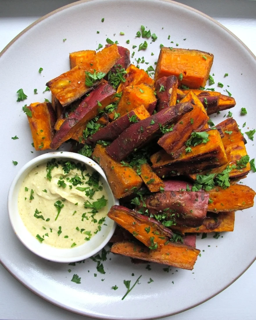 Cinnamon Cumin Sweet Potato Wedges with Curry Mustard Dip