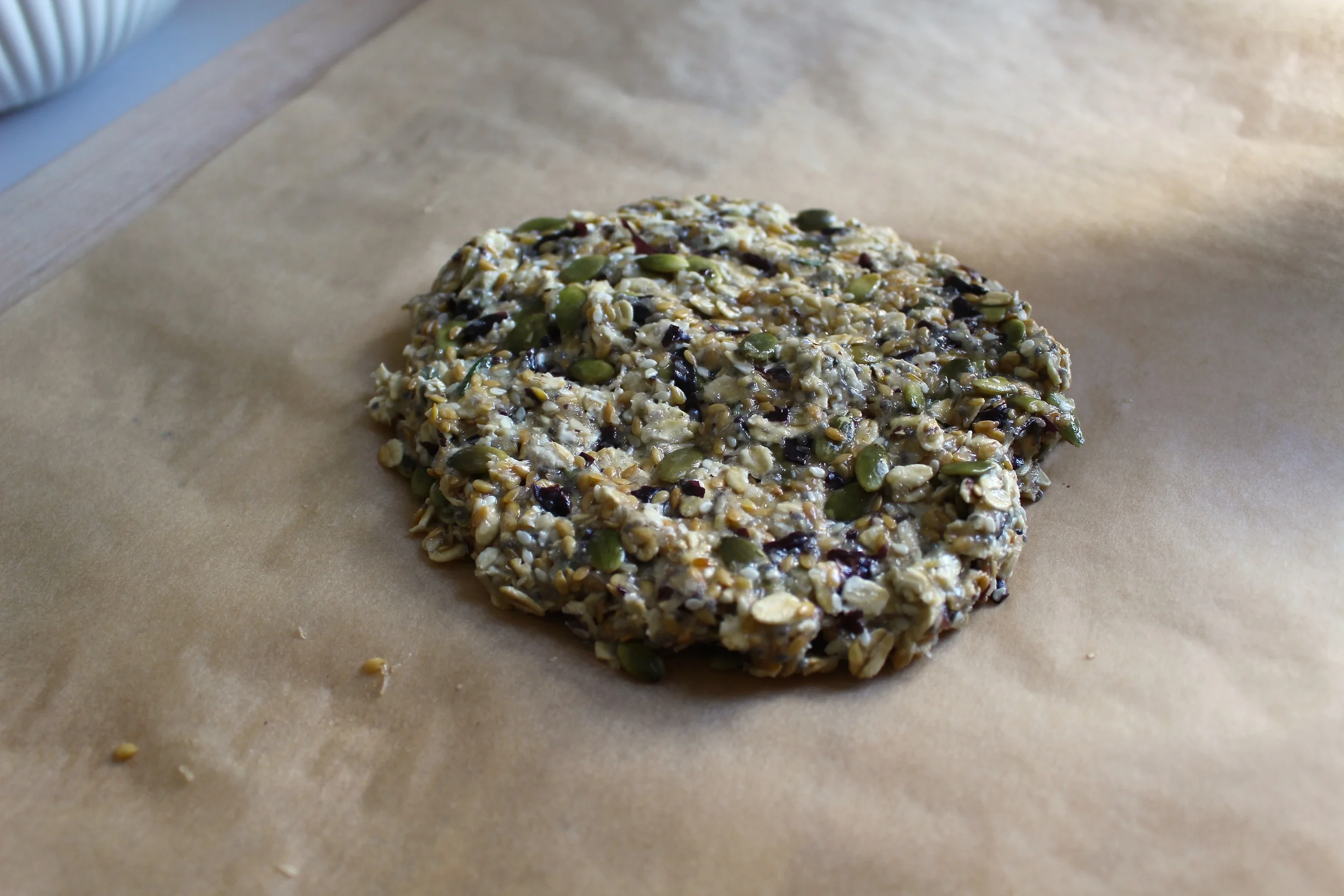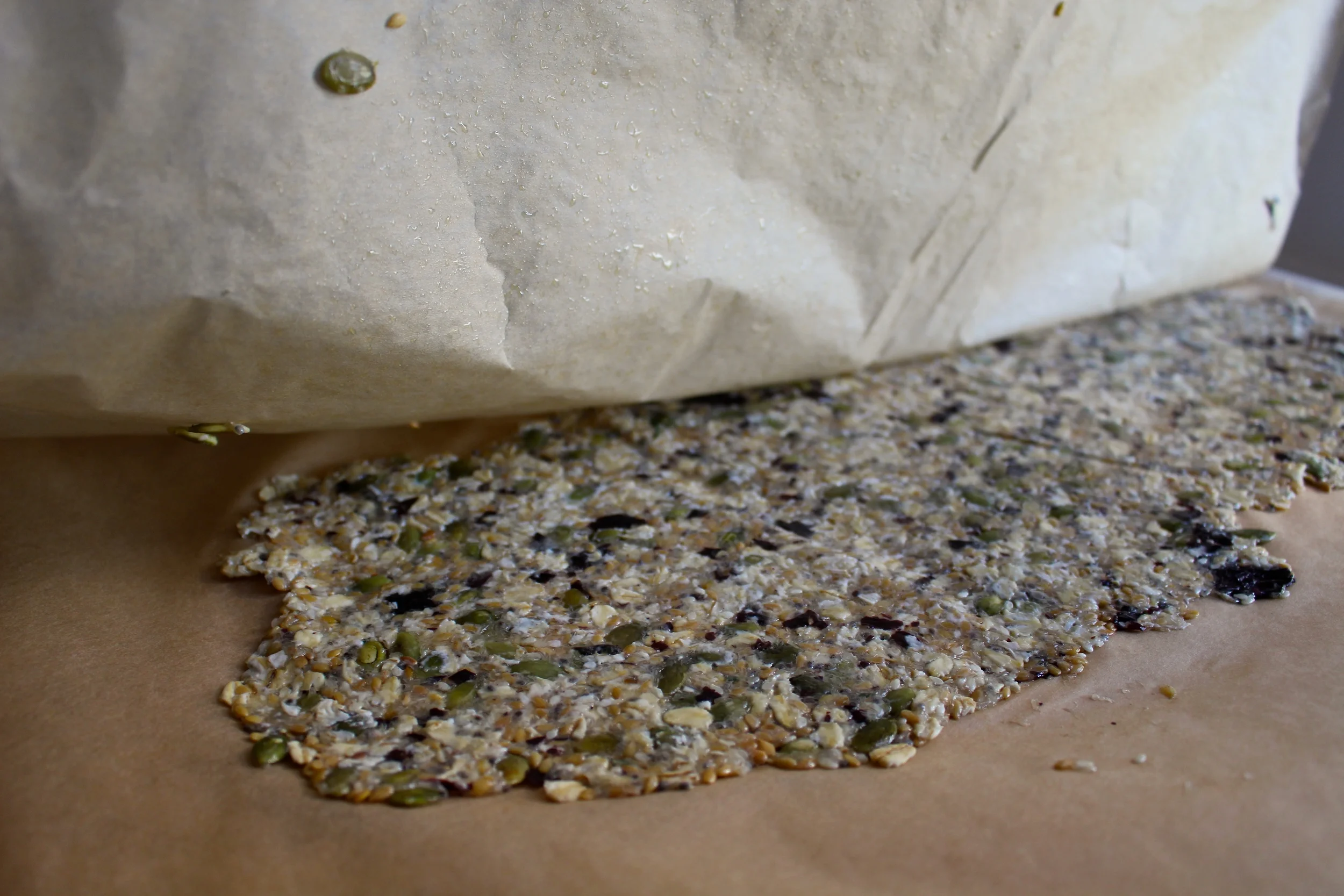 - Slide the bottom half of the parchment paper with the dough mixture onto a baking tray (make sure the top parchment is removed). Bake for 20 minutes. Remove from oven, grasp the parchment paper and crackers together, and carefully flip the whole mixture over. Cracker mixture will be flush with the sheet tray. Peel the parchment paper off, and bake for an additional 10 minutes or until dry, crispy, and golden. If some pieces are not crisp, break them off and bake some more. Repeat with second batch.