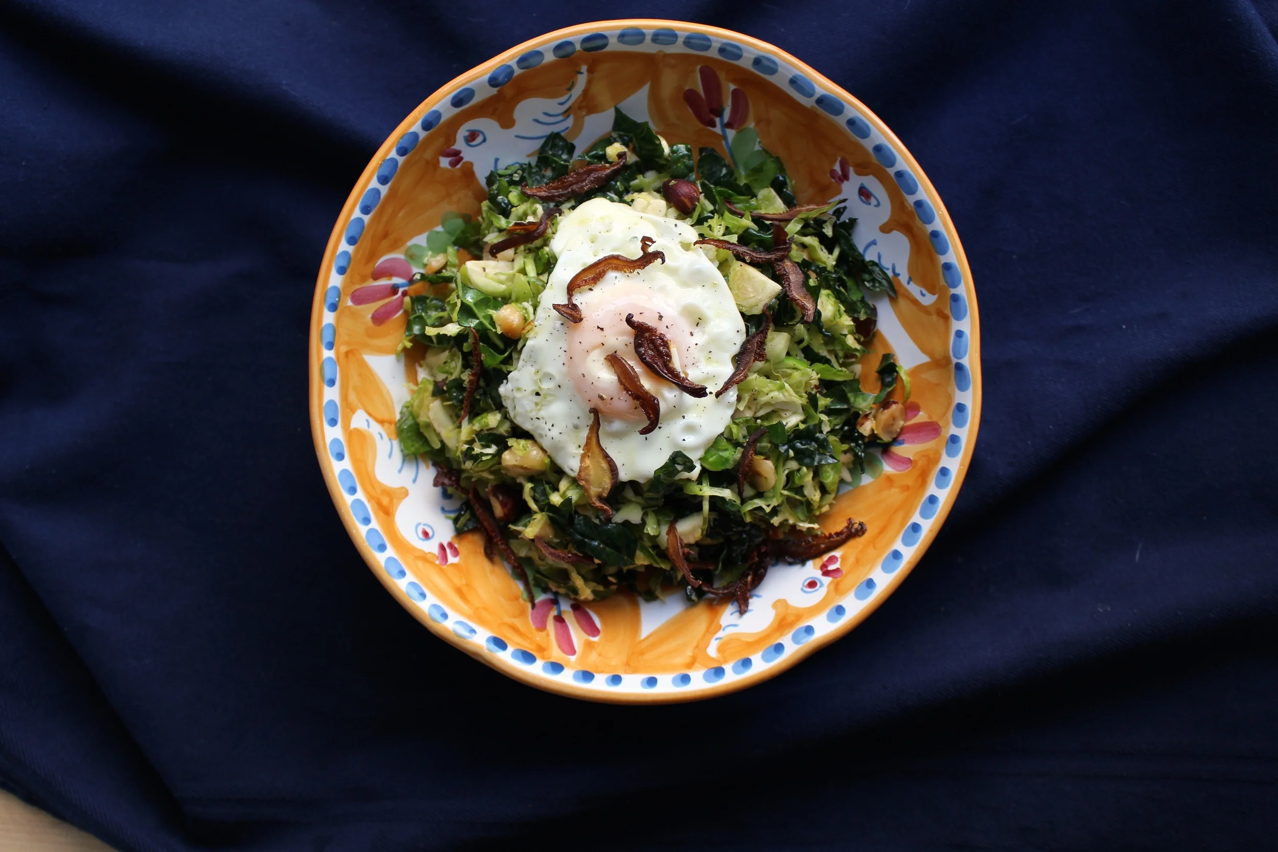 My mother-in-law made a version of this crunch fest at our Thanksgiving meal. I loved it and happily scooped up the leftovers to enjoy the day after. This salad does not reinvent the wheel, but the combo of kale and brussels sprouts paired with a lemony dijon dressing will make anyone feel virtuous and revived. Vegans or purists, omit the cheese. For a more complete meal, top with a poached egg and shiitake bacon.