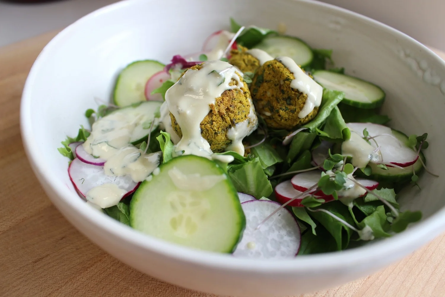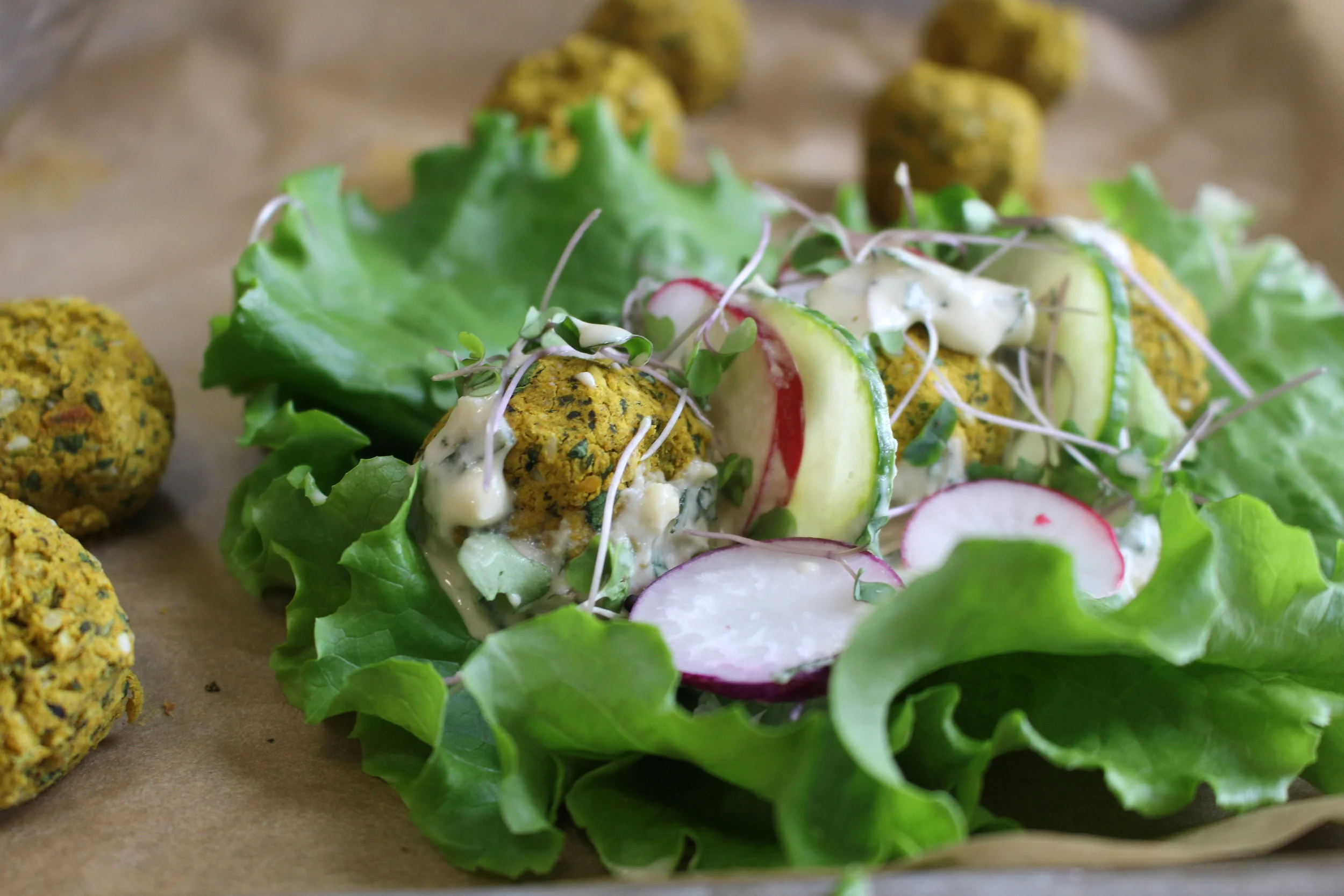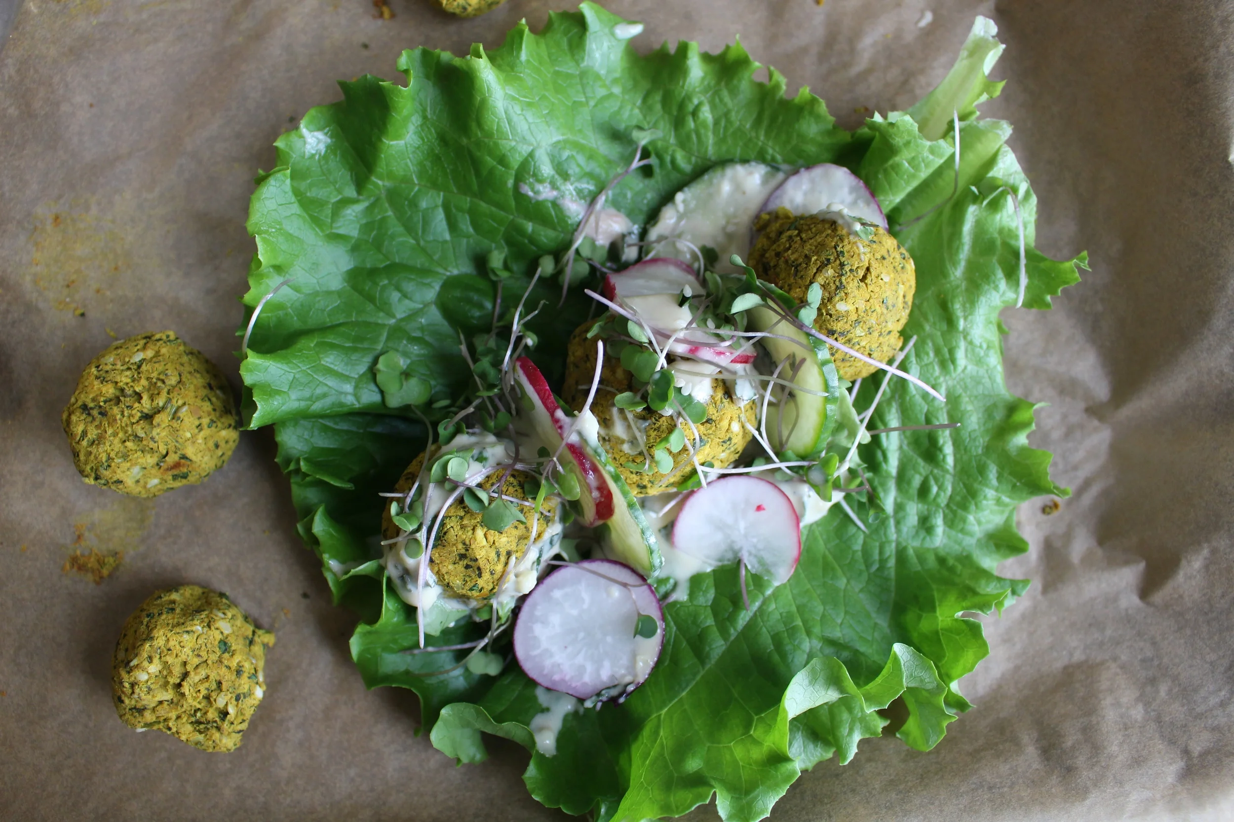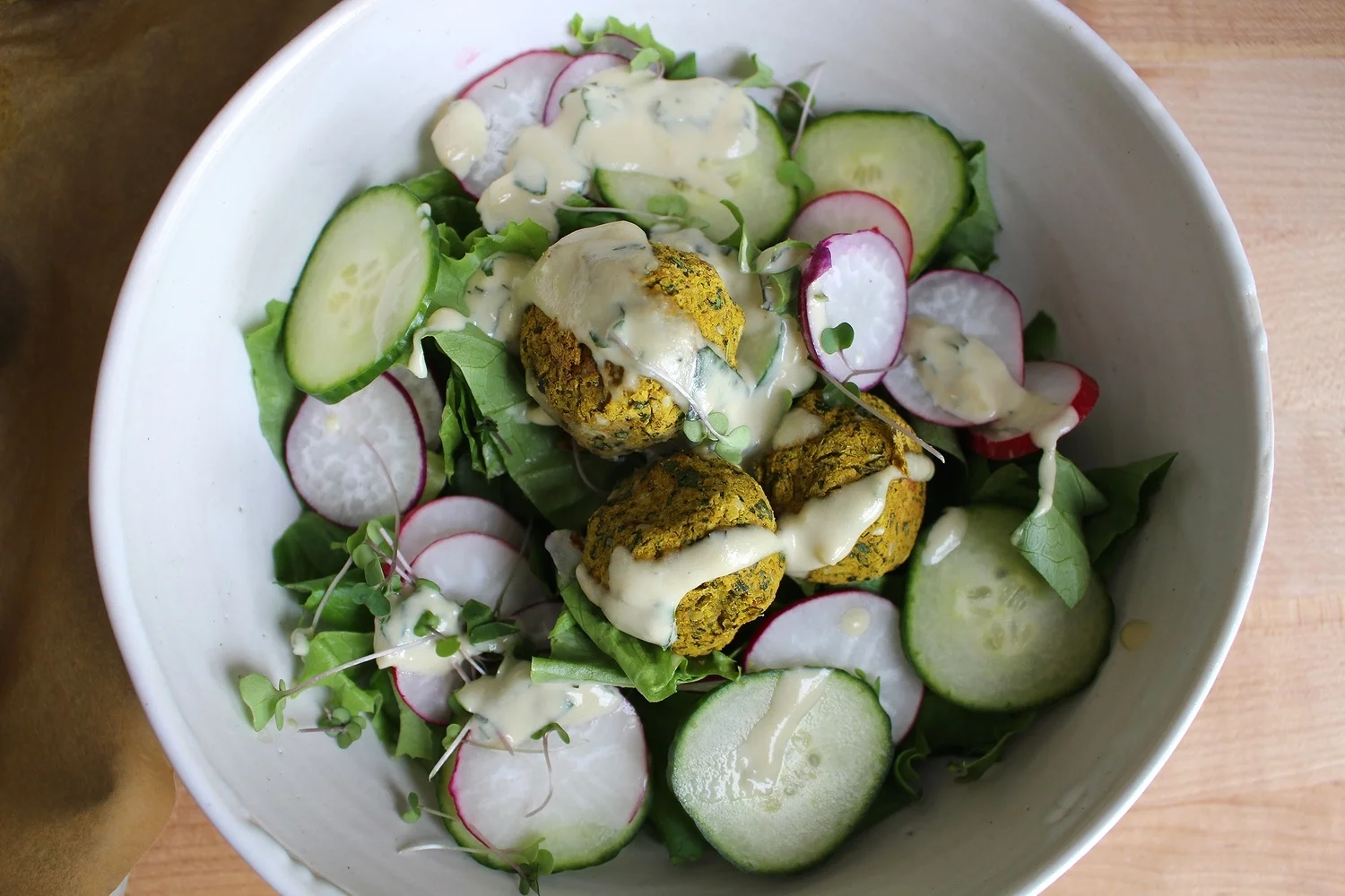 - Top a mixed green salad with the falafel or place onto durable greens garnished with cucumber, radish, microgreens, and a hearty drizzle of tahini.