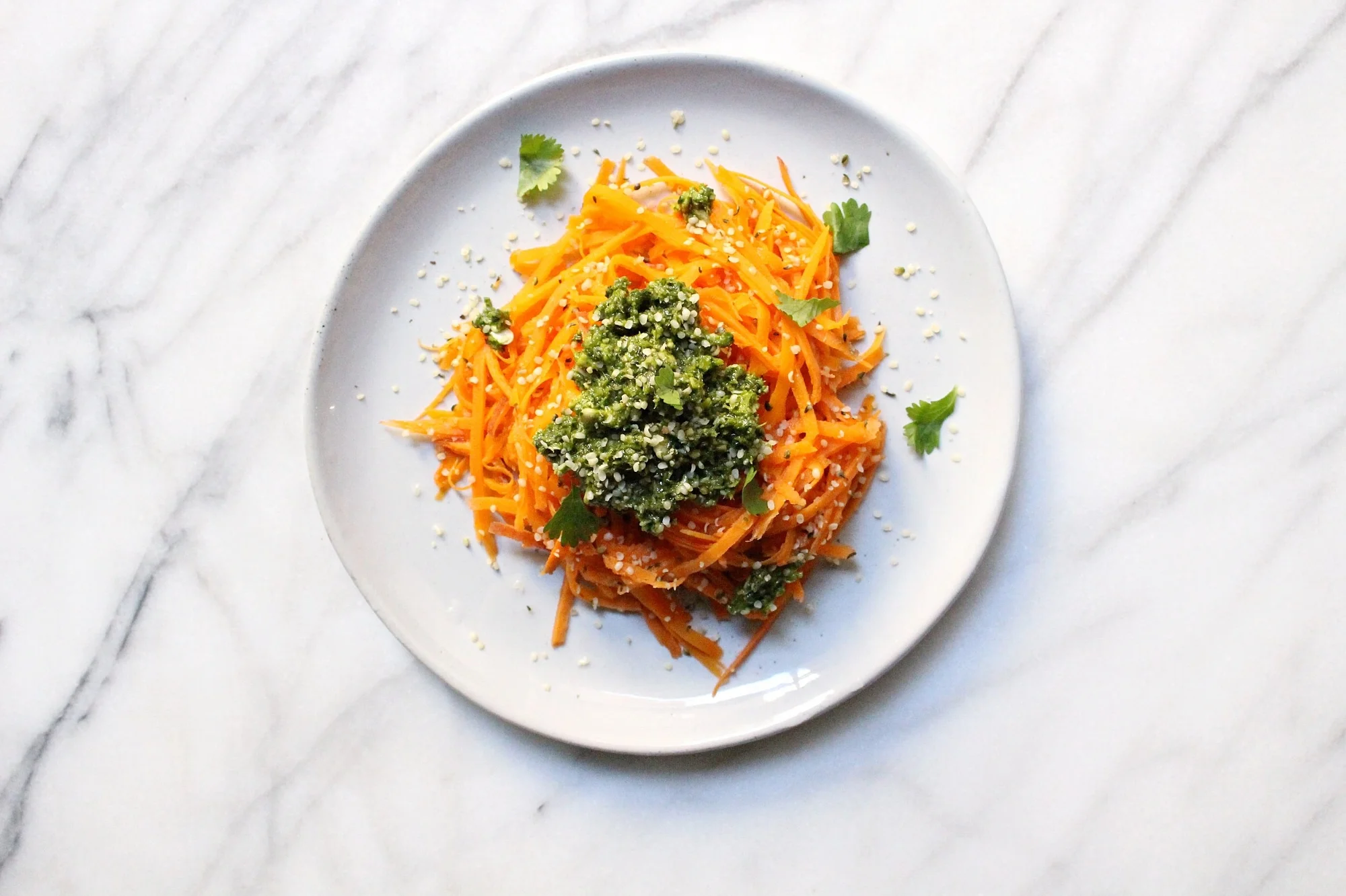 Looking for a bright and flavorful lunch packed with nutrients. Look no further then these sweet potato noodles with kale pesto. Don't want sweet potatoes? Swap in carrot and loose the blanching step, if you prefer raw vegetable noodles. Orange-hued fruits and vegetables are full of Vitamins A and C, and of course, fiber.