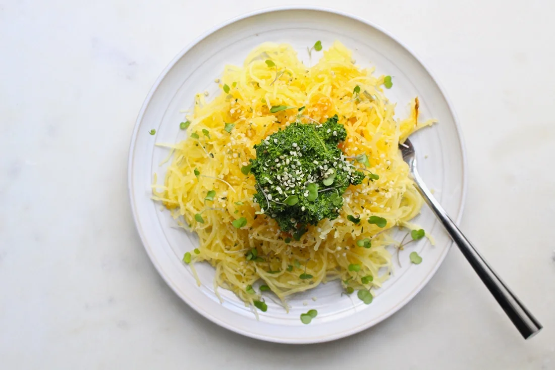 As the squash roasts, boil a pot of lightly salted water. Have an ice bath on hand. Toss in kale for 30 seconds and immediately transfer to an ice bath. Using a dish towel or your hands, squeeze out as much water as you can from the kale. Place kale, herbs, chili flakes, garlic, walnuts, and lemon juice into a food processor. With the motor running, drizzle in olive oil until all ingredients are well blended and a pesto is formed. Finish with a pinch of salt and pepper, taste, adjust seasoning if needed. Spoon pesto over spaghetti squash, and garnish with hemp seeds and microgreens.