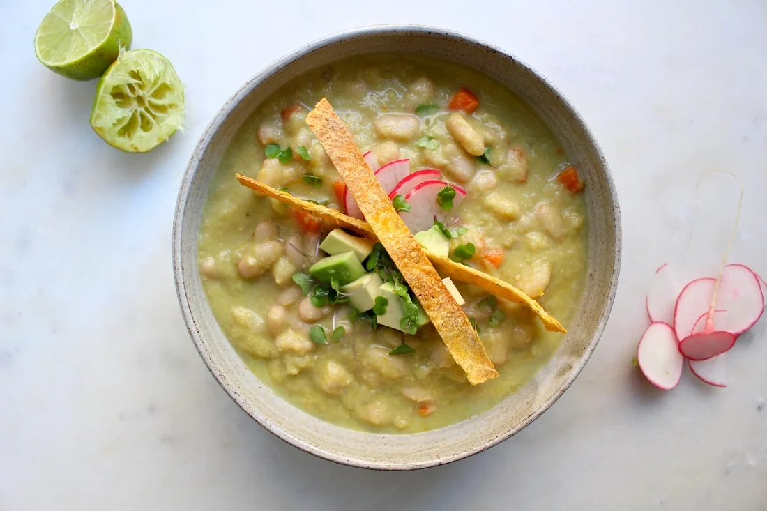 Once the beans are cooked, add the tomatillo puree to the pot. Mix well to combine and cook on low heat for 5 to 10 minutes. Season with white pepper, taste, and add additional salt, if needed.