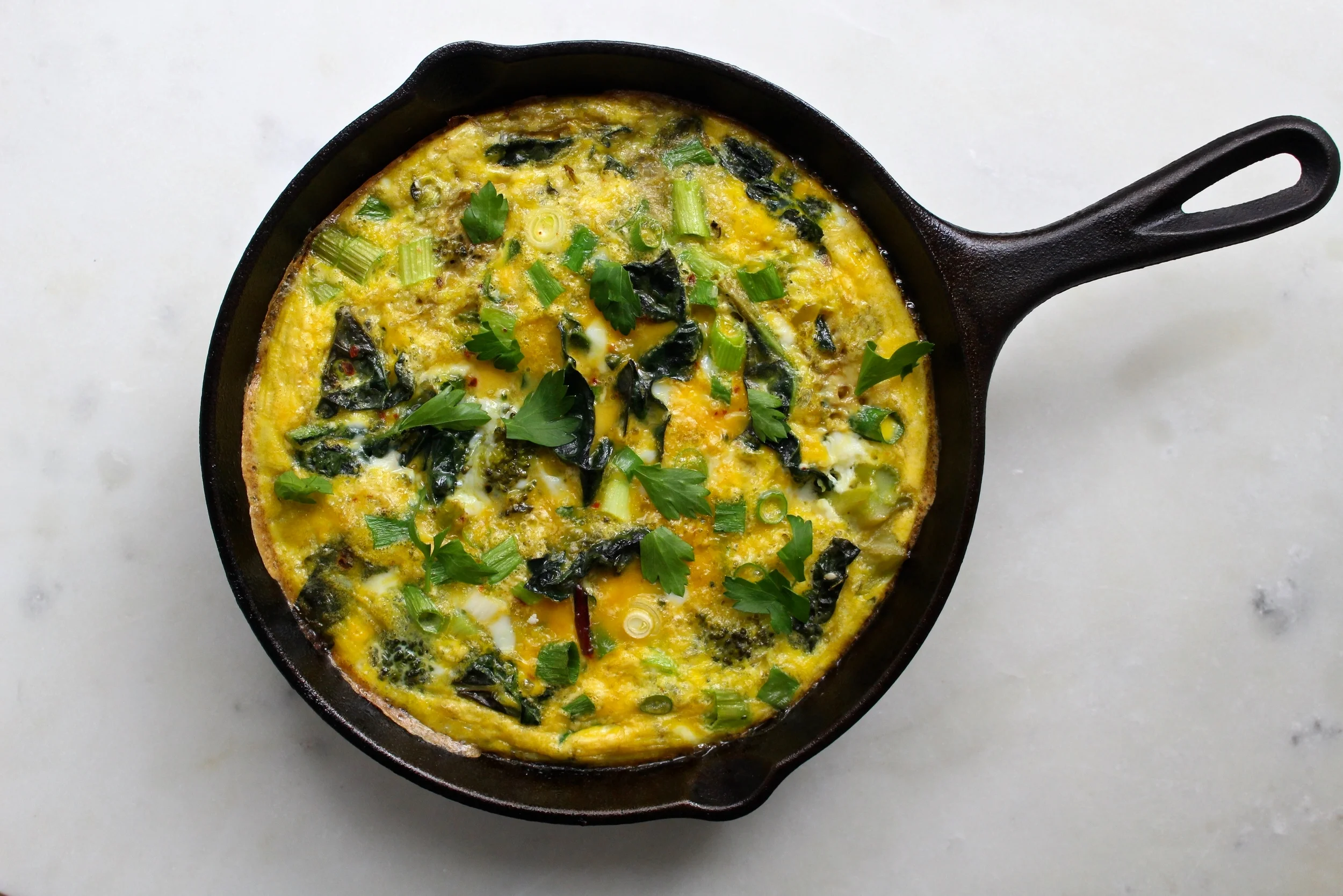 Preheat oven to 350°. Heat 1 tbsp oil in an 8-inch ovenproof skillet or cast iron pan over medium heat. Add broccoli florets and stems and sauté until softened. Remove and set aside. Add a touch more olive oil to the pan and toss in the kale stems. Sauté until softened. Add the kale leaves and cook until barely wilted. While the greens cook, whisk the eggs, scallions, salt, and pepper in a large bowl. Increase the heat to medium-high and add the broccoli back to the pan with the kale. Add a tsp more oil to the skillet and pour the eggs over the vegetables, shaking the pan to evenly distribute the mixture. Cook the frittata, without stirring, until its edges begin to set, about 3-5 minutes. Transfer skillet to oven. Bake frittata until golden brown and center is set, 20-25 minutes. Check the frittata five minutes before it is ideally supposed to be done to avoid overcooking. Top with fresh herbs and serve with a lightly dressed salad of mixed greens or cut up and refrigerate for a quick breakfast, lunch, or dinner.