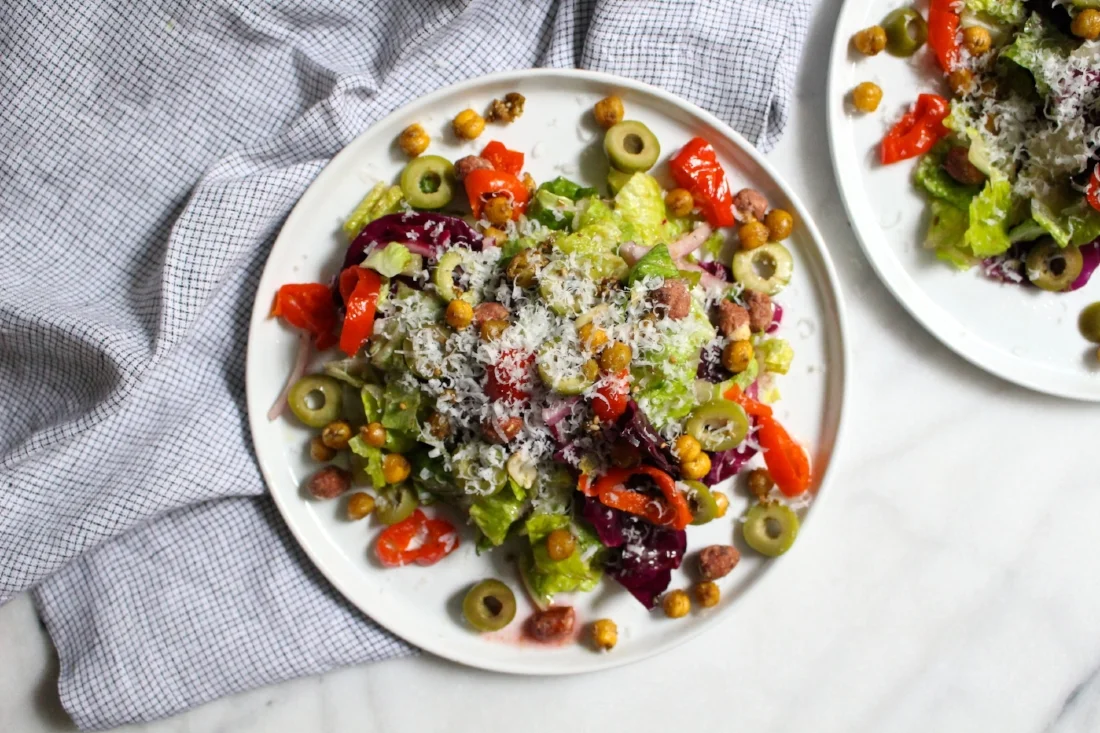 Add the romaine, radicchio, peppers, red onion, and olives to the dressing. Toss to combine. Finish with crispy chickpeas, peanuts, and grated parm.
