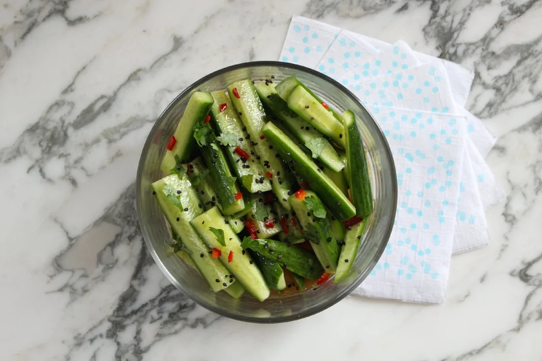 In a bowl, whisk together brown rice vinegar, minced red chili pepper or dried red pepper flakes, and toasted sesame oil. Place cucumber into a bowl, cover with dressing, sprinkle with black or white sesame seeds, chopped cilantro, and toss to coat. Refrigerate for at least an hour before enjoying.