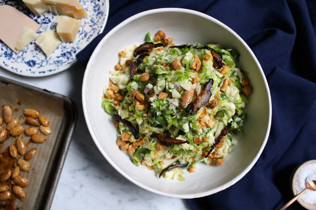 brussels sprout + shiitake bacon salad with smoked paprika almonds