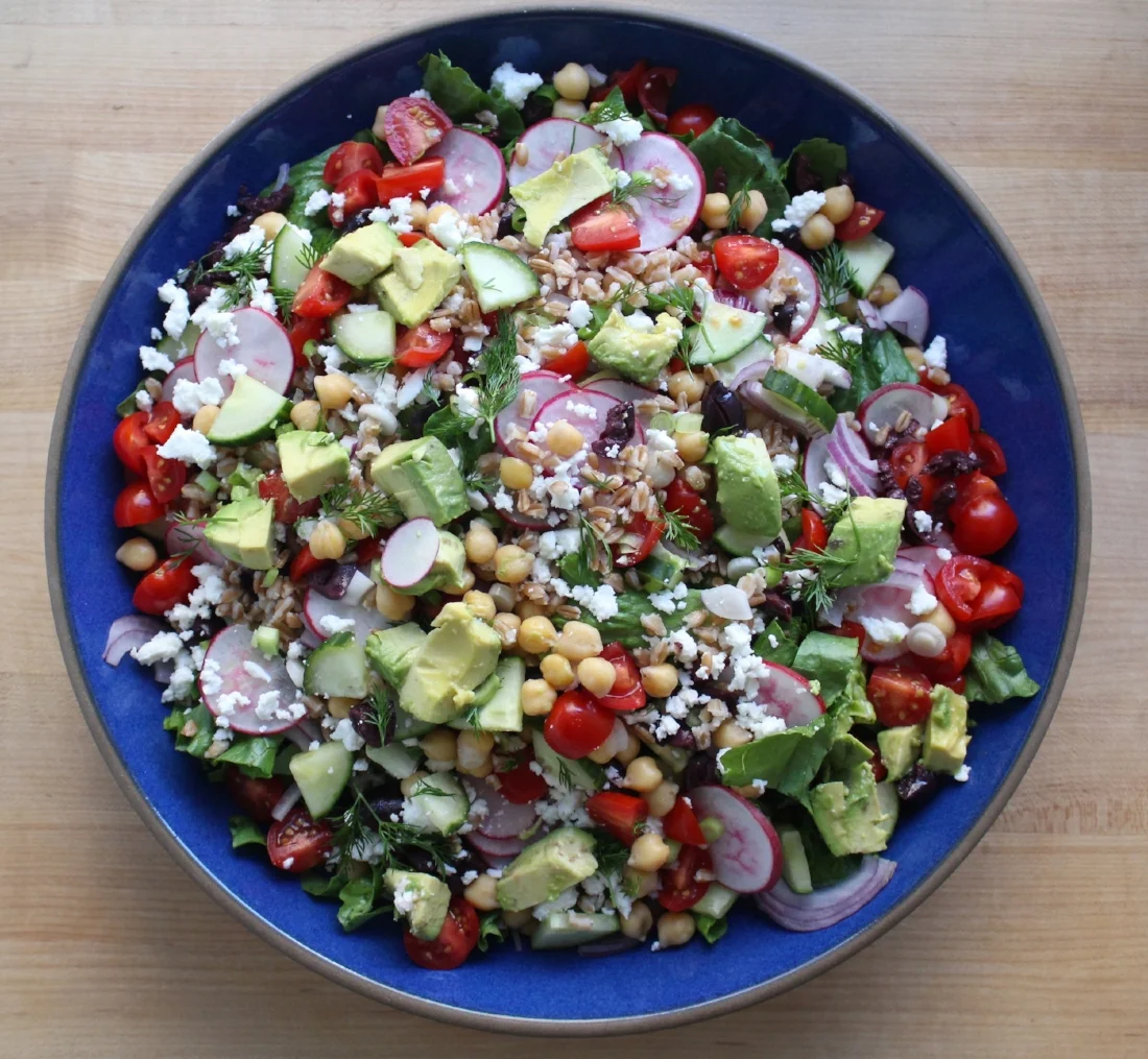 In a large bowl, combine the romaine, chickpeas, farro, cucumbers, red bell peppers, olives, tomatoes, red onion, radish, scallions, and half of the feta, avocado, and dill. Pour dressing over salad, toss to coat. Scatter the remaining feta, dill, and avocado over the top and serve.