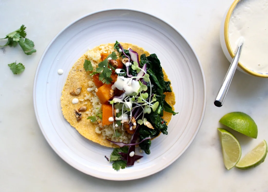 To assemble, warm the tortillas on a baking sheet in a 350°F oven or toast in a dry skillet on the stovetop over medium heat. Place the warm tortillas on a platter or onto individual plates. Divide the millet among the tortillas. Top with squash and kale mixture, cabbage, avocado slices, scallions, and cashew cream.
