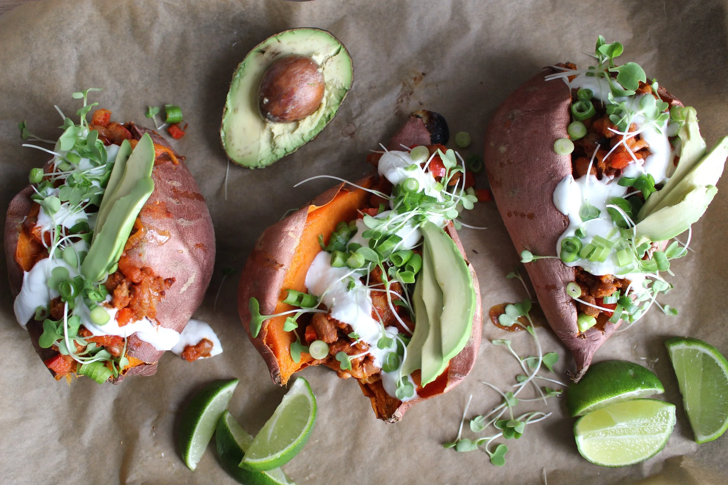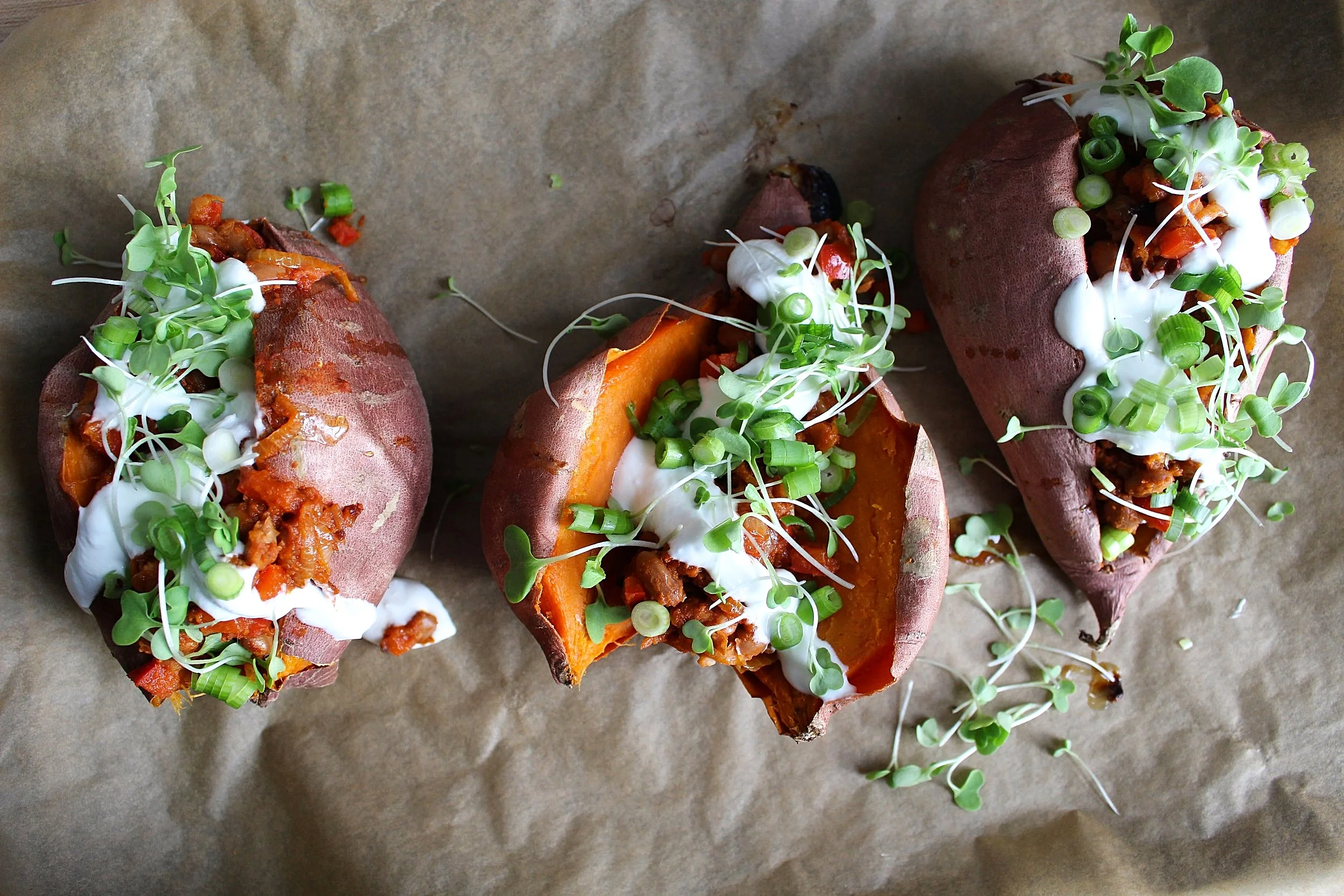 - Slice each potato down the center, almost through to the bottom. Open to reveal the orange flesh. Spoon in the beans and top with selected garnishes.