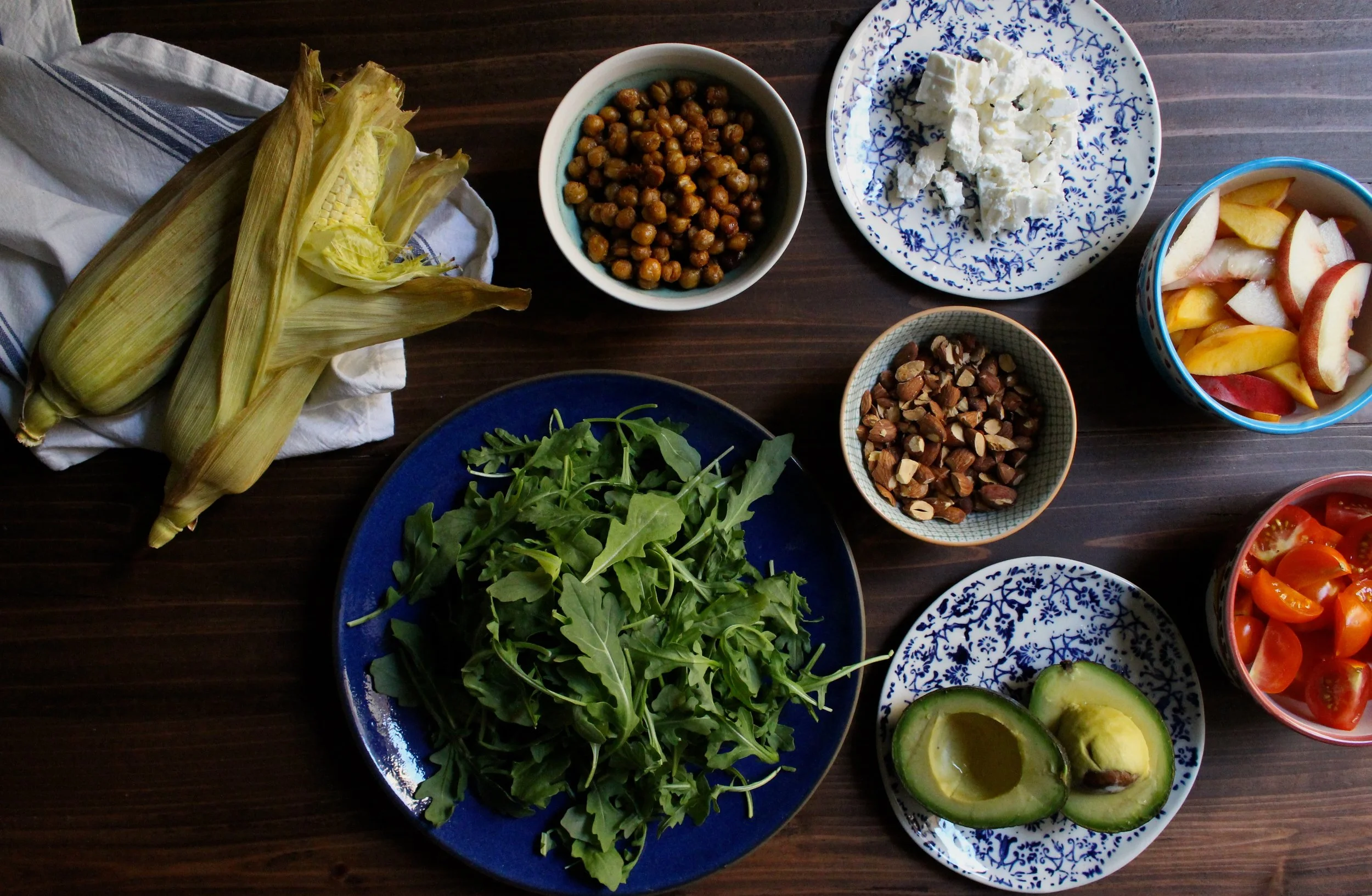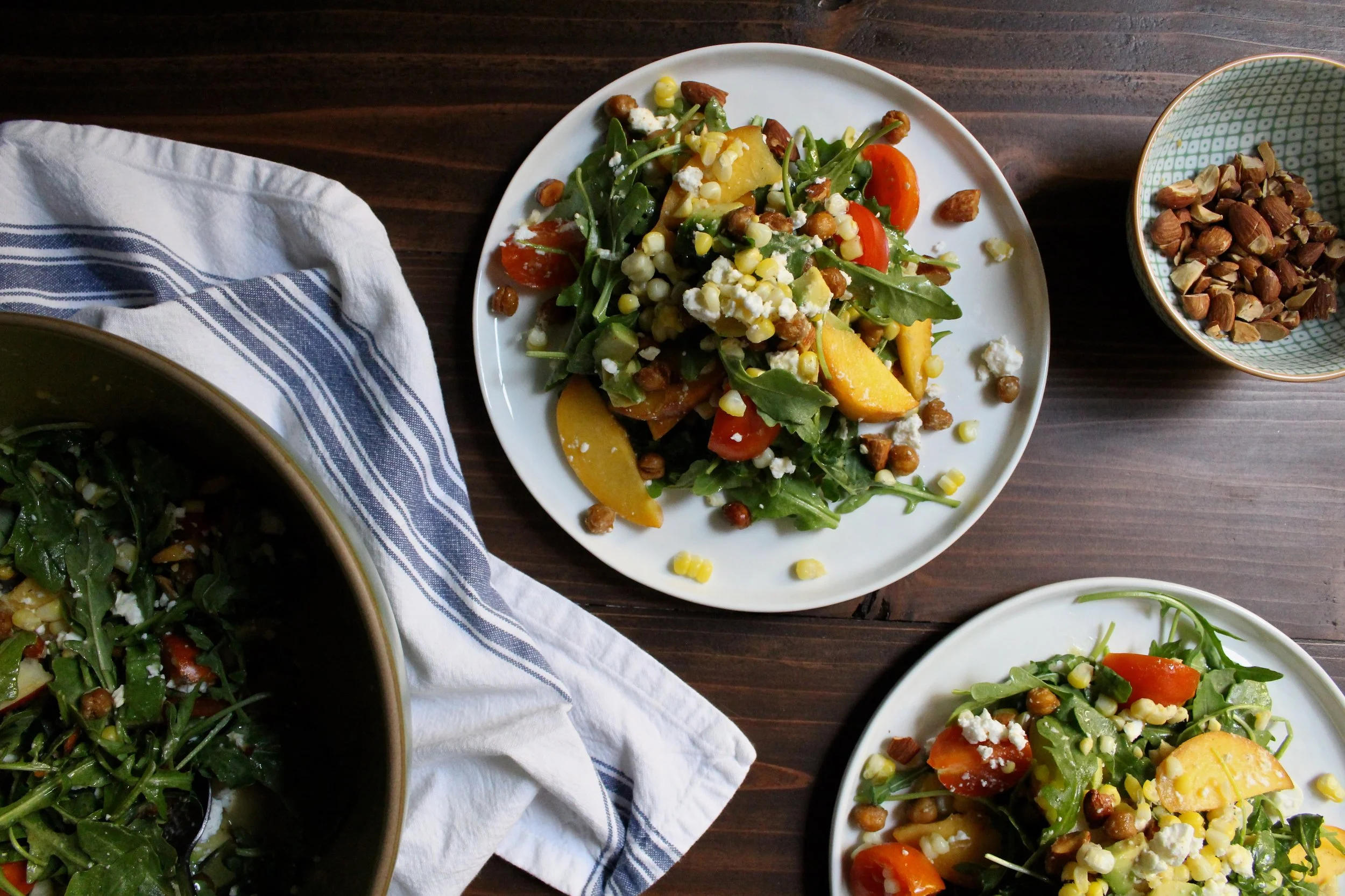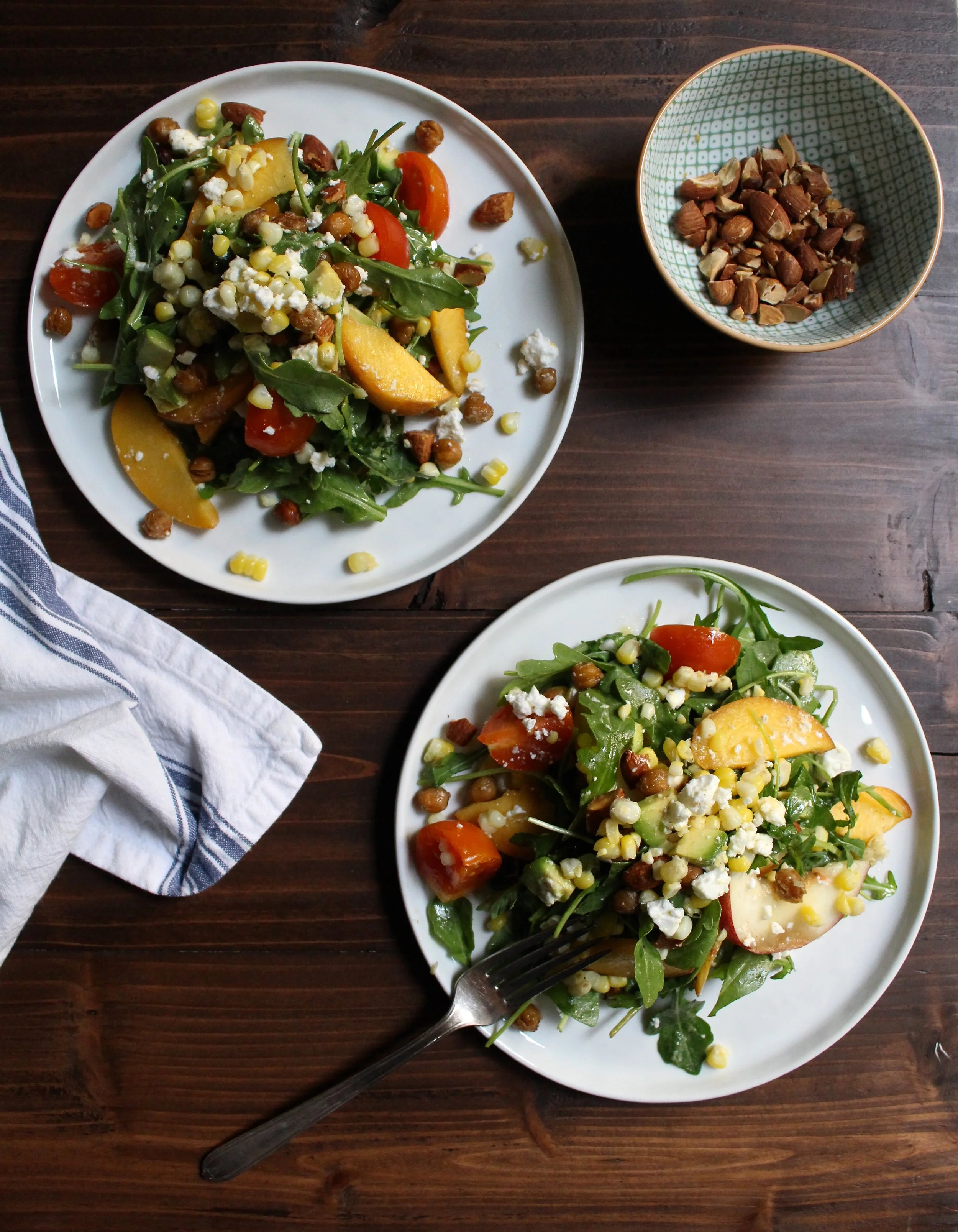 It is hard to believe that it is already August. Once the 4th of July rolls through, summer always seems to jump into hyper speed. Good thing that my favorite season is just at summer's coattails - fall! Before we enter "pumpkin spice land", let's savor all of late summer's bounty. This salad captures just that and features peaches, corn, and sun gold tomatoes tossed together with peppery arugula, crispy crunchy chickpeas, toasted almonds, and creamy tart feta. It's perfect for a hot summer night or a simple poolside lunch.