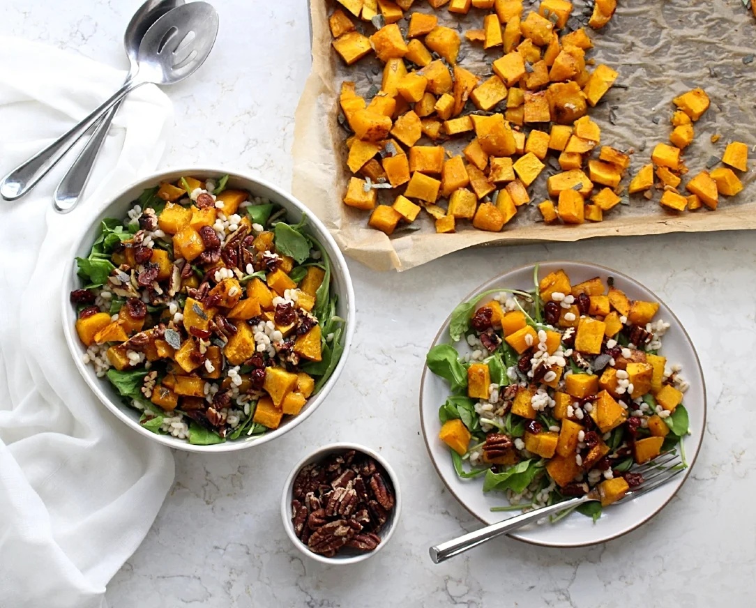 Pour half of the salad dressing into a large salad bowl or rounded serving platter. Add most of the warm grain and most of the squash and toss to combine. Add the greens, the rest of the dressing, and most of the cranberries and pecans, reserving some for garnish. Scatter the top of the salad with the reserved grain, squash, cranberries, and pecans, and shaved cheese, if you wish.