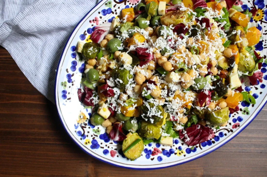 In a large bowl toss the chickpeas with 1/4 cup vinaigrette. Let sit for 10 minutes. Add scallions, provolone cheese, and olives to the chickpeas. Next add in squash and brussels sprouts and toss. Add the romaine and radicchio and more vinaigrette to taste. Serve with grated ricotta salata and enjoy.