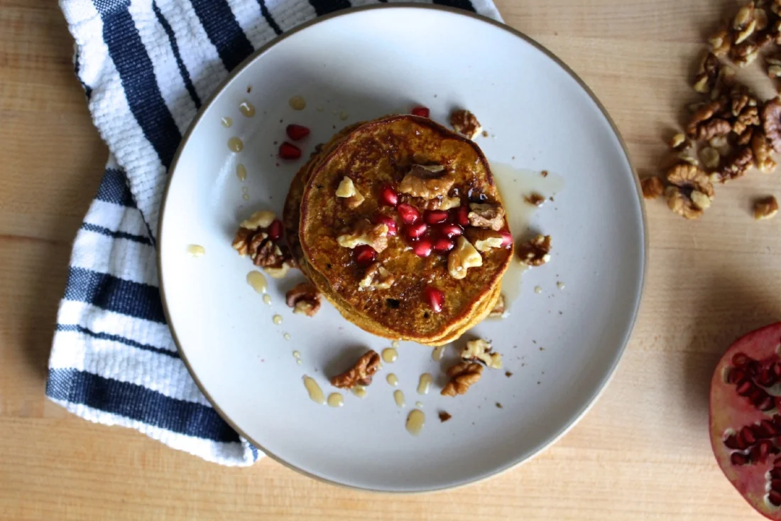 In a blender, combine the oats, pumpkin puree, eggs, vanilla bean powder, baking powder, maple syrup, and spices. Blend until smooth. In a skillet, warm two teaspoons of coconut oil over medium-low heat. Pour one to two tablespoons of batter for each pancake into the pan. Cook for about one minute or until golden on bottom. Flip and cook until the other side is golden (about one to two minutes). Repeat until you finish the batter, adding additional coconut oil to the pan as needed. Top with pomegranate seeds, maple syrup, walnuts, and additional toppings, if you wish.