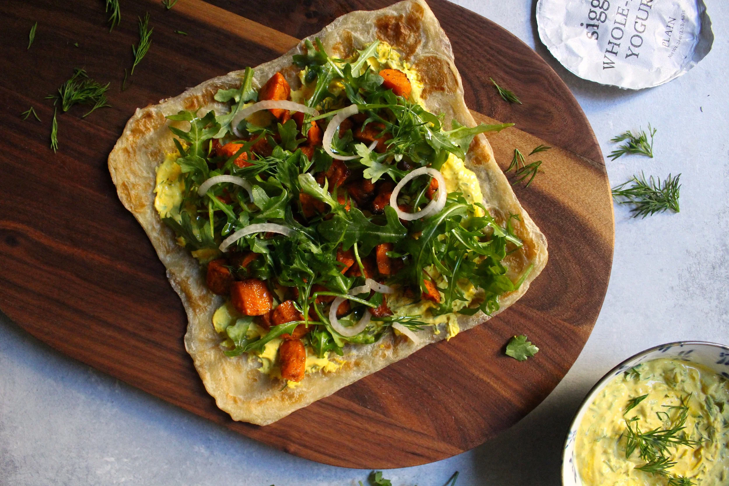 flatbread with cumin roasted carrots, turmeric yogurt, pickled red onions, and arugula